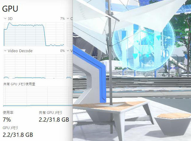 GPU-3Dが90%以上になってます。他に誰もいないワールドでコレ。