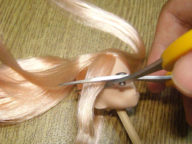 さらに前髪を仮止めしていた結束針金をはずし、耳にかからず、もみあげにかかるあたりでカット。